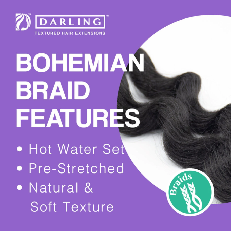 "Darling’s Bohemian Braid is made with premium quality synthetic fibers that are tangle-free, easy to manage, and soft to the touch. Available in a range of colors, Darling's premium textured fibers blends seamlessly with natural and straightened hair KEY FEATURES: Natural & Soft Texture, Tangle-Free, No Shedding, Long- Lasting, Light & Ready to Wear, Natural Luster, Premium Synthetic Fiber STYLING TIPS: Feed-in Braids, Individual Braids, Goddess Braids, Cornrows, Side-Swept Cornrows, Braided Ponytail CARE & MAINTENANCE TIPS: Wrap your hair up at night with a satin bonnet or scarf to reduce friction and frizz WASHING TIPS: Frequent washing affects luster and shine. However, in case of build up from gels and product from hair maintenance: Dilute shampoo with water, apply to scalp and gently massage; Allow shampoo to run through the length of your curls, but do not apply shampoo directly to curls; Follow shampoo with conditioner, repeat the same steps; Rinse thoroughly with water; To dry, gently squeeze out excess water with towel and pat dry DARLING IS NATURAL TEXTURED & SIMPLY BEAUTIFUL HAIR EXTENSIONS: Darling specializes in the elevation of simplistic beauty & the illumination of confidence, instantly transforming how a woman sees herself & how she’s treated in the world; Darling celebrates any ambitious woman who’s working her way to the top; We're with her on her journey" 52" Darling Pre-Stretched Bohemian Wave Braid Hair for Women.